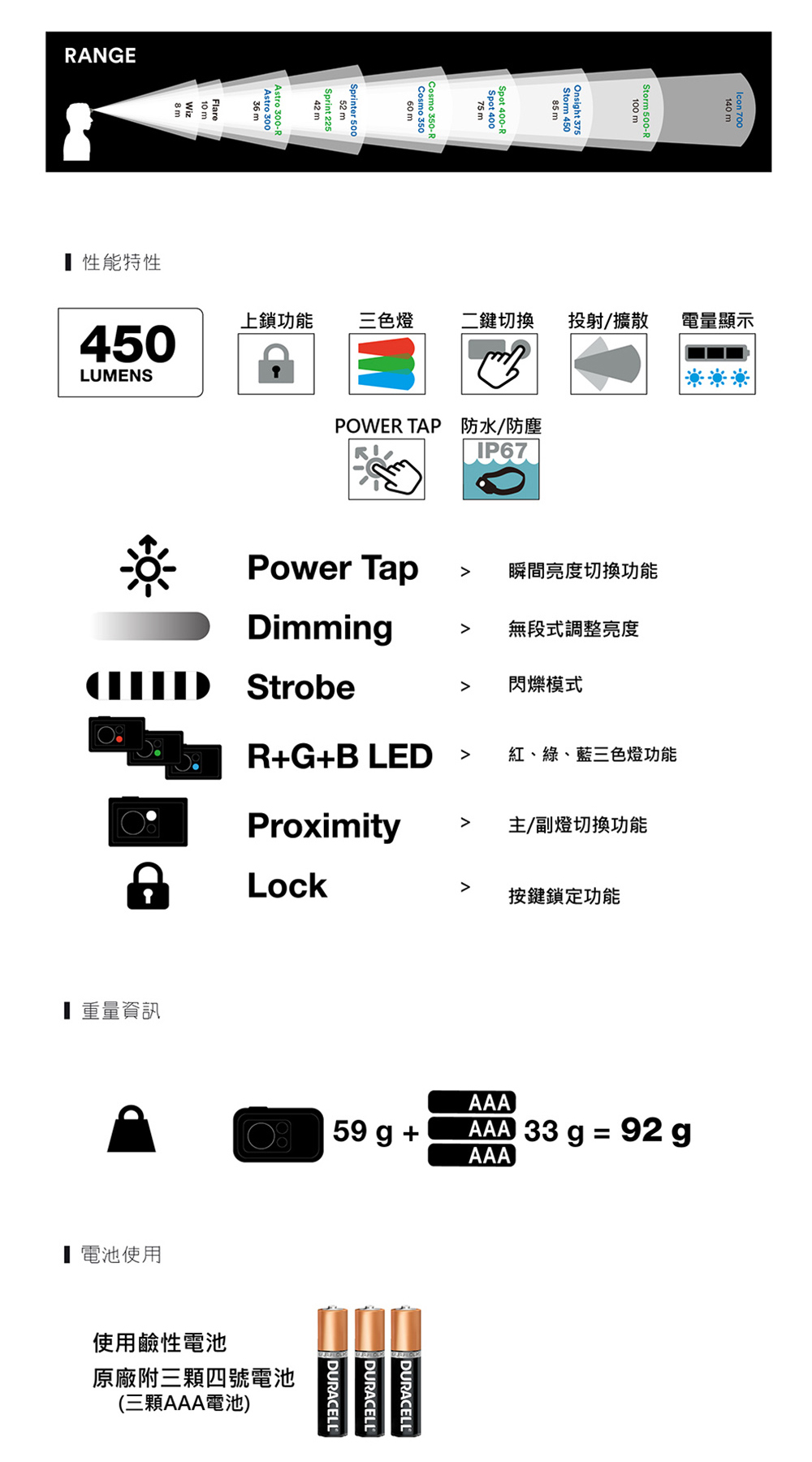 重量/ 92g( 含三顆四號電池)
