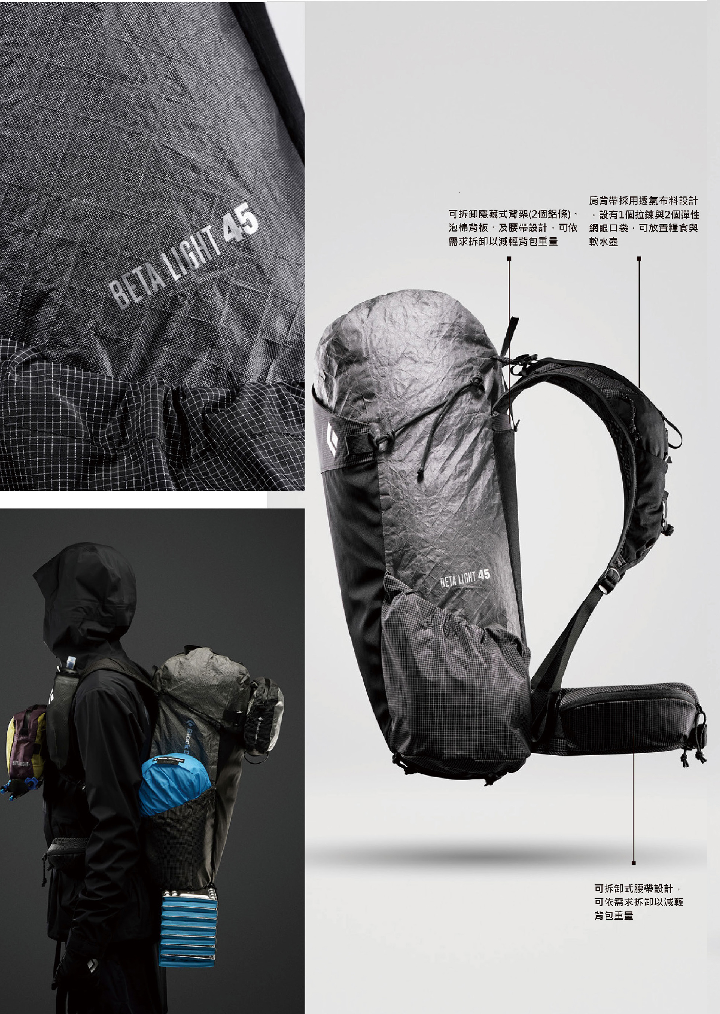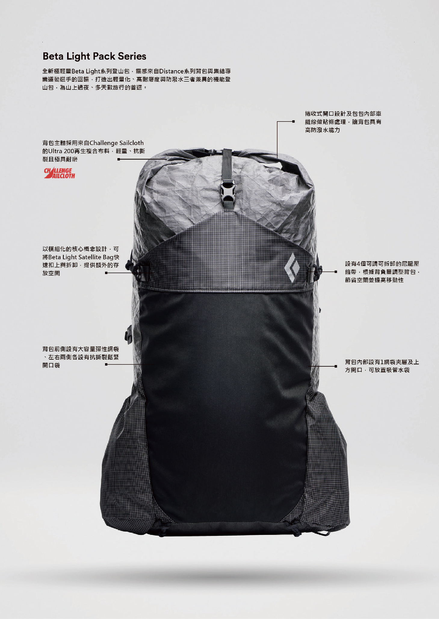 說明 / 與 Challenge Sailcloth 合作,其布料極度耐磨且輕量,適合多天數的登山背包