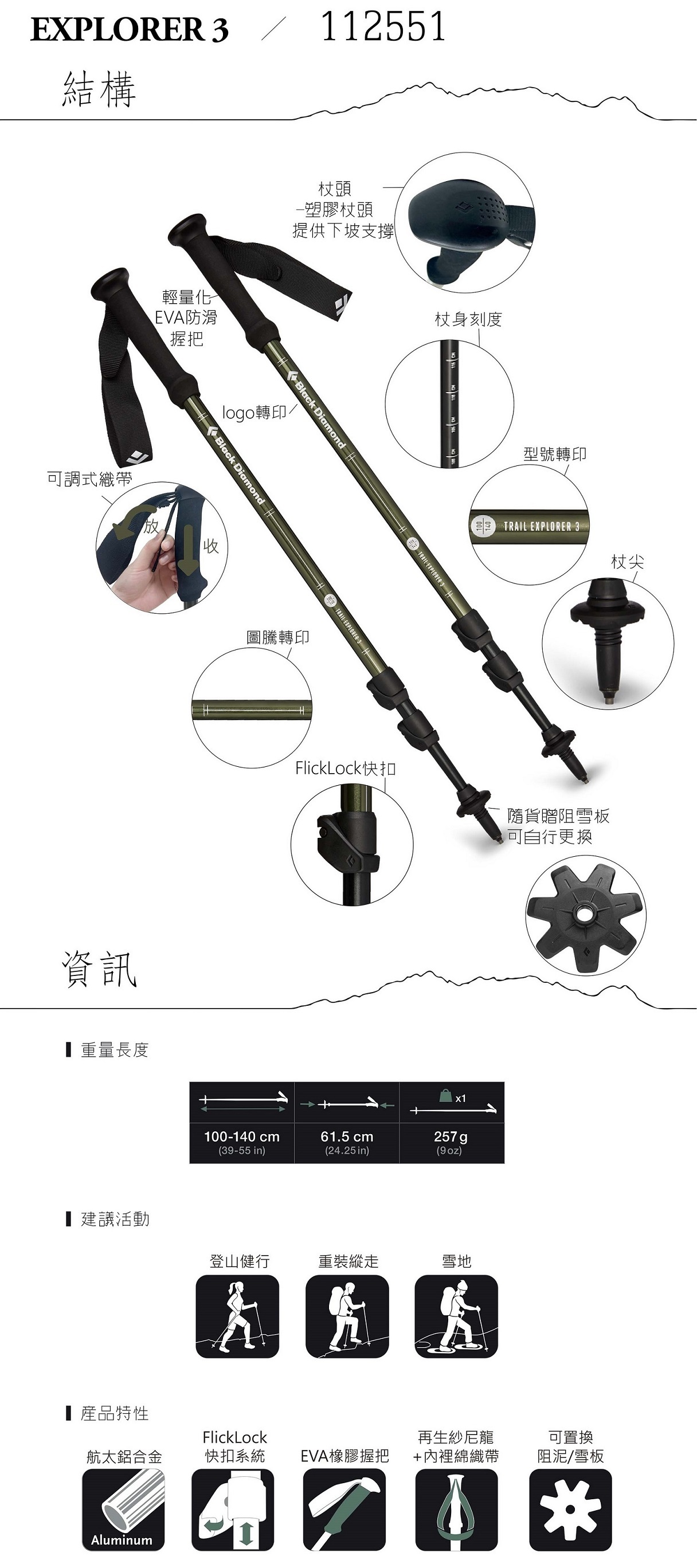 - 塑膠杖頭,提供下坡的支撐性
